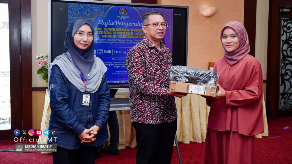 KUALA NERUS, 20 April 2025 – Seramai 46 pelajar Universiti Malaysia Terengganu (UMT) daripada golongan keluarga B40 menerima sumbangan komputer riba menerusi Program eKasih dalam satu majlis penyerahan rasmi yang diadakan di kampus universiti itu, baru-baru ini.