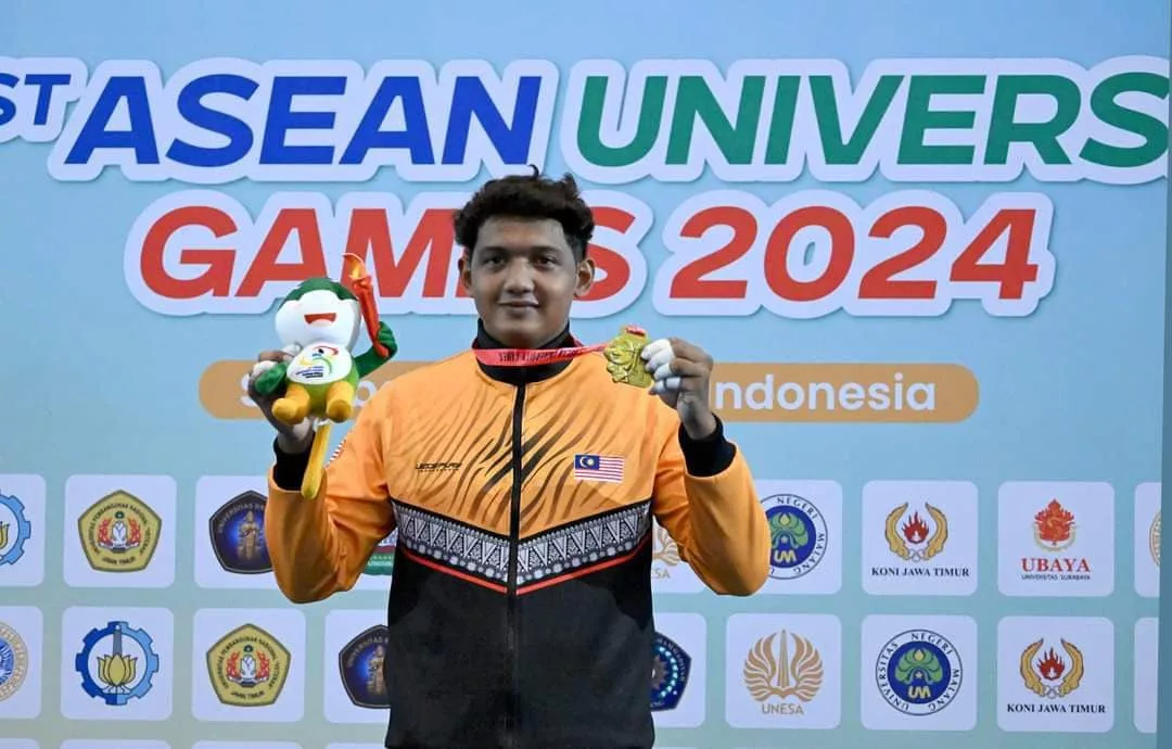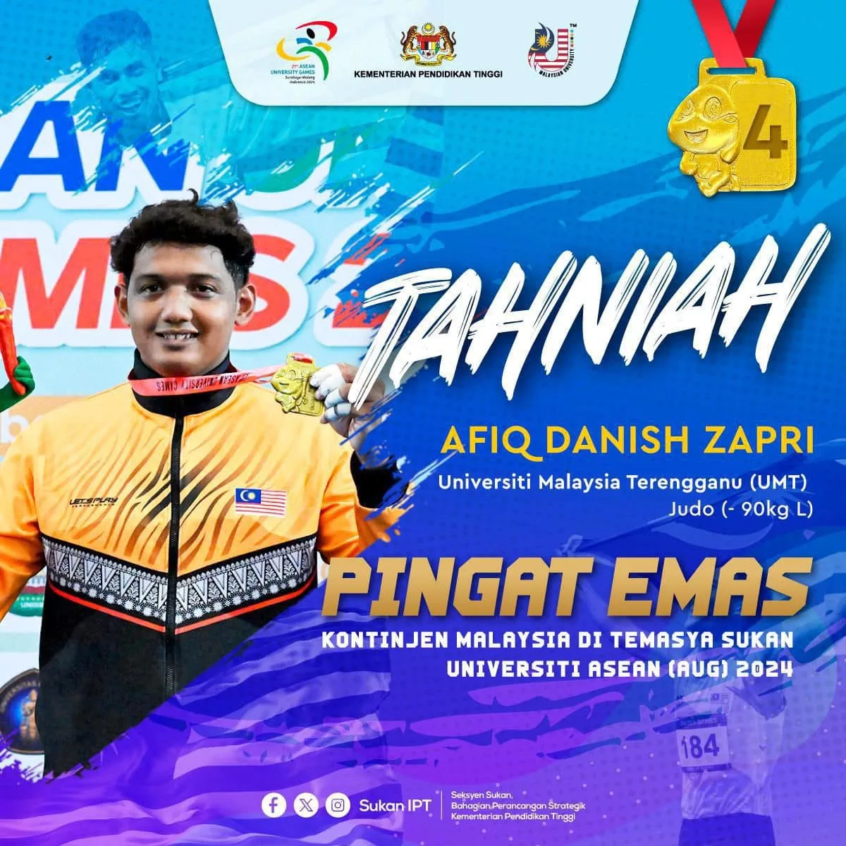 Pelajar Universiti Malaysia Terengganu (UMT) antara atlet yang berjaya menghadiahkan pingat Emas negara dalam penganjuran Sukan Universiti Asean (AUG) 2024 yang berlangusng di Pusat Konvensyen Airlangga.