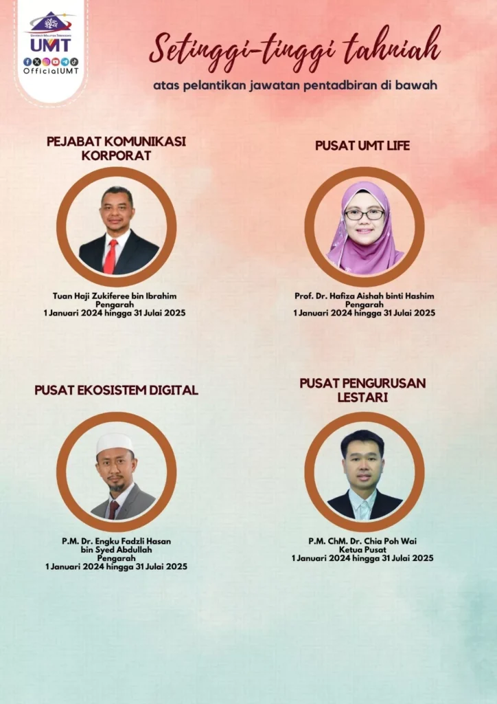 Universiti Malaysia Terengganu (UMT) has exercised a small-scale restructuring as part of the effort to further strengthen the identity and achievement of the university. With the recent move, a faculty has been renamed and another newly set up, and two new departments has been strategically created. The aim is to align the organizational structure with the current and future needs of higher education in Malaysia.