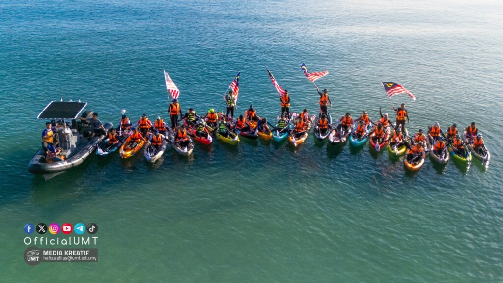 The UMT Merdeka Kayak Expedition 2025 (14-16 August) at Pulau Bidong brought together 40 students from UMT, Universiti Malaysia Pahang Al-Sultan Abdullah, Universiti Malaysia Kelantan, and Universiti Sultan Zainal Abidin. Participants faced the challenge of paddling 22 kilometres from INOS Beach, UMT, to Pasir Tenggara Beach, Pulau Bidong, with an estimated paddling time of six hours. They were accompanied by five escort boats from the Sailing Training Centre, the Fire and Rescue Department of Malaysia, and the University Health Centre. Each institution was also represented by its accompanying officers.