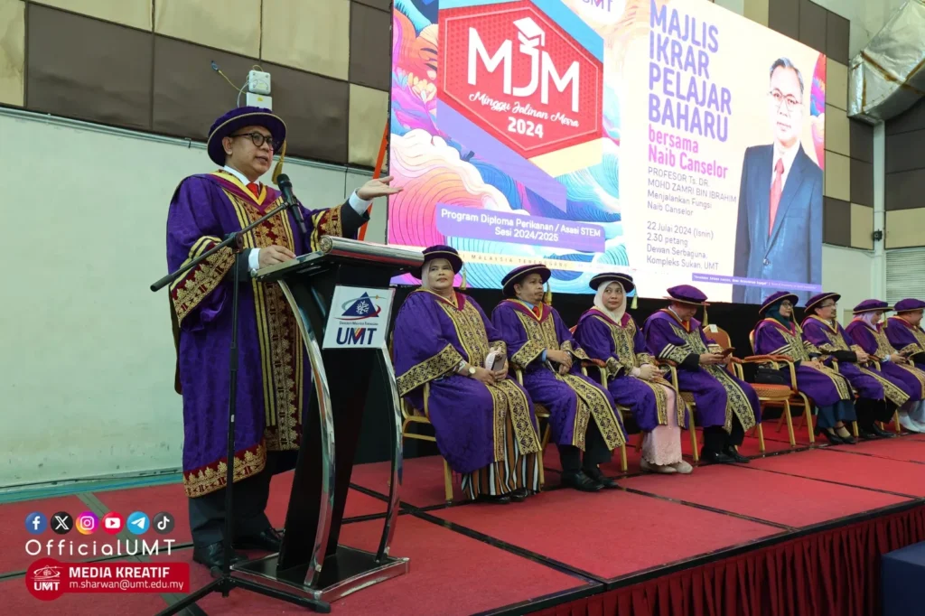 “Therefore, your duty is to fulfil their hopes to the best of your ability, to extend your services for the sake of the religion, race, and nation,” said Prof. Zamri in his speech during the Student Oath Taking Ceremony involving new students for the 2024/2025 session at Tengku Muhammad Ismail Sports Complex, UMT.
