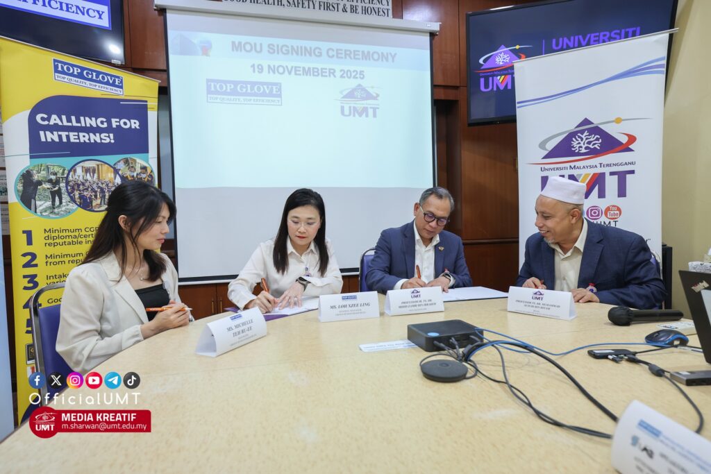 Universiti Malaysia Terengganu (UMT) formally entered into a collaborative partnership with Top Glove Corporation Berhad (Top Glove) through a Memorandum of Understanding (MoU) signing ceremony held at Top Glove Factory 9. The event on 19 November marked a milestone in strengthening the university & industry ecosystem, particularly in promoting academic advancement, capacity building, and knowledge exchange in the field of teaching and learning.