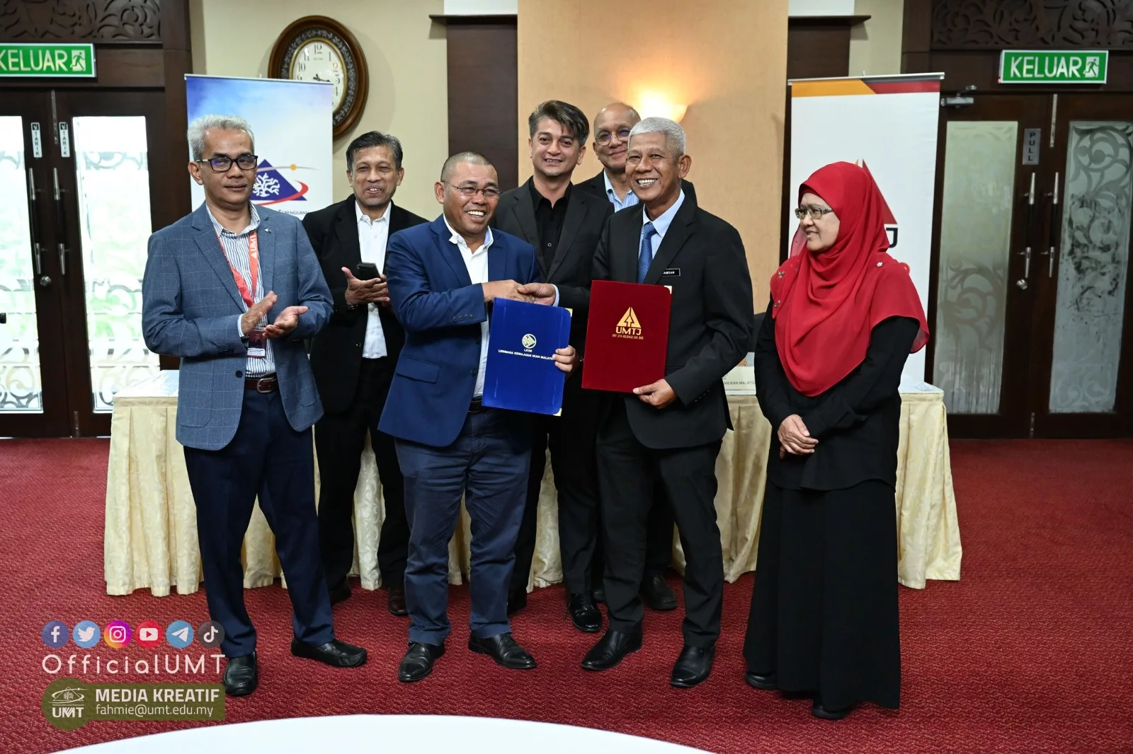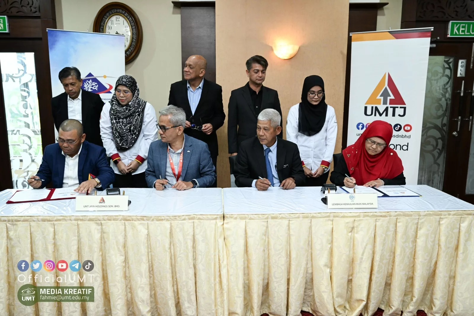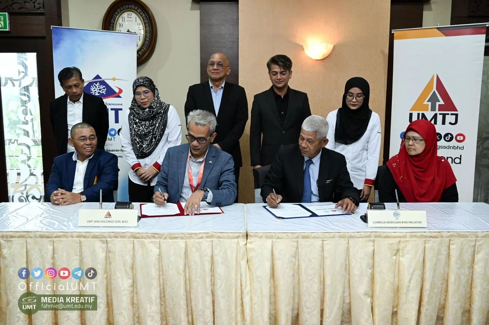 Kuala Nerus, 15 Januari 2024 – Universiti Malaysia Terengganu (UMT) melalui anak syarikat, UMT Jaya Holdings Sdn Bhd (UMTJ) memeterai perjanjian persefahaman (MoU) dengan Lembaga Kemajuan Ikan Malaysia (LKIM) bagi membangun, memperkukuh dan memajukan industri perikanan Malaysia.